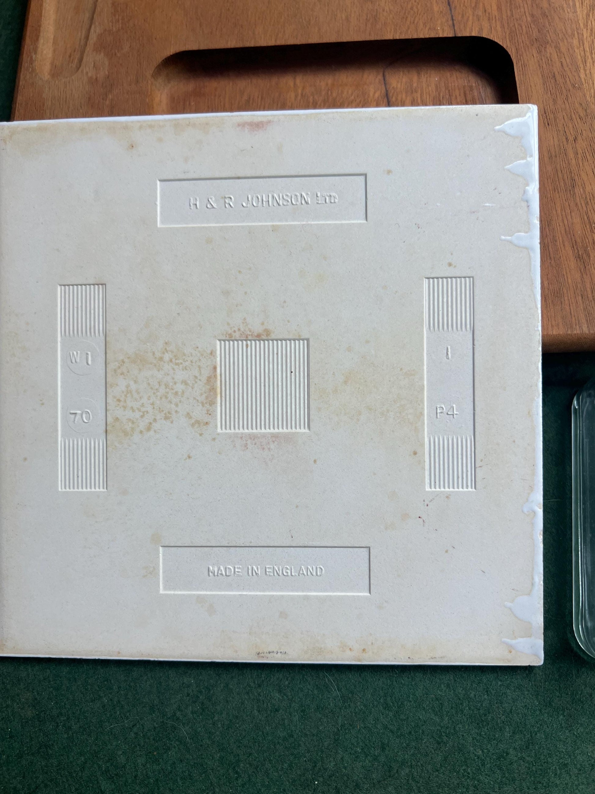 1970s MCM cheese board Wooden cheese serving platter ceramic tile insert Butter dish and original knives.