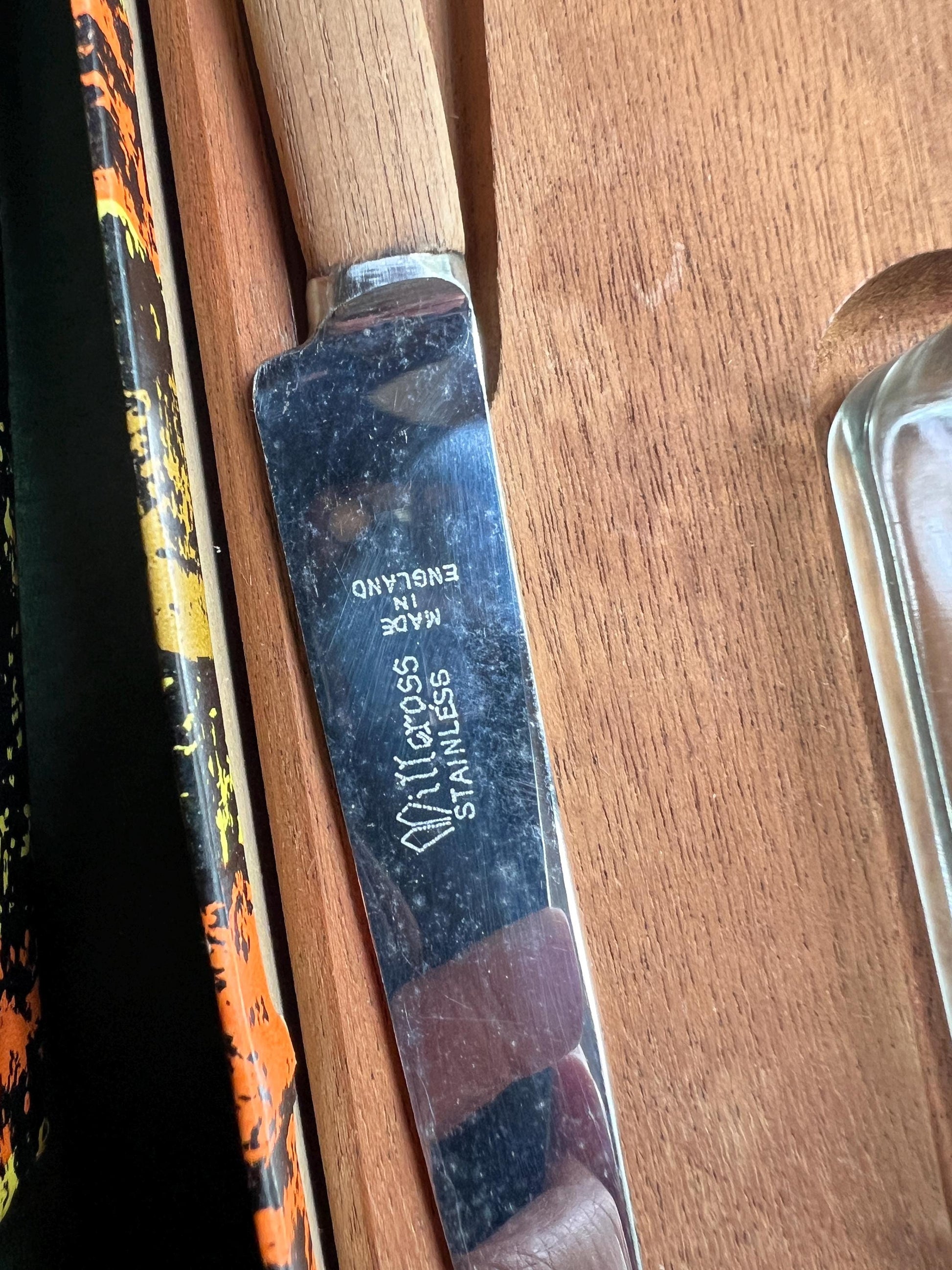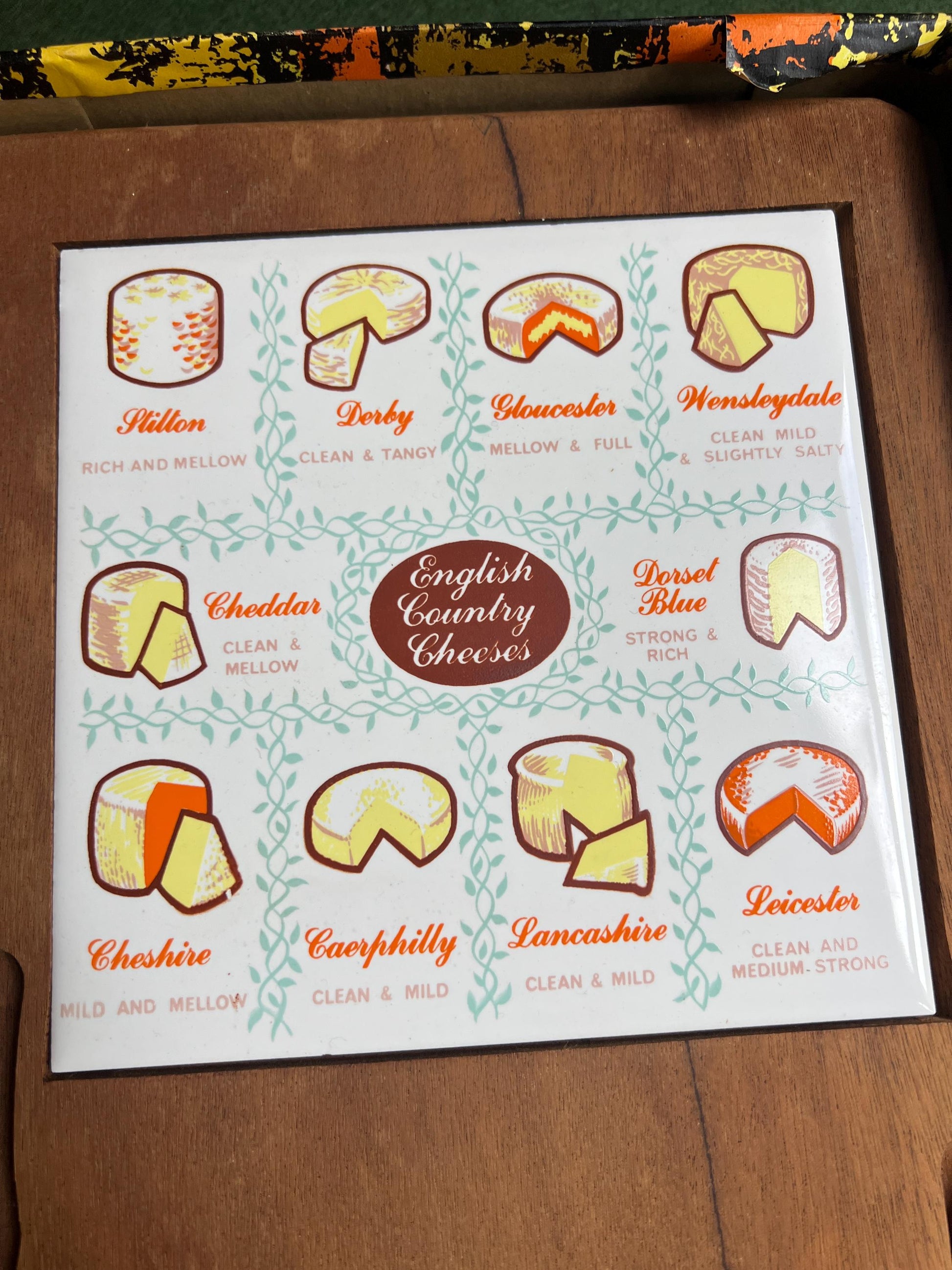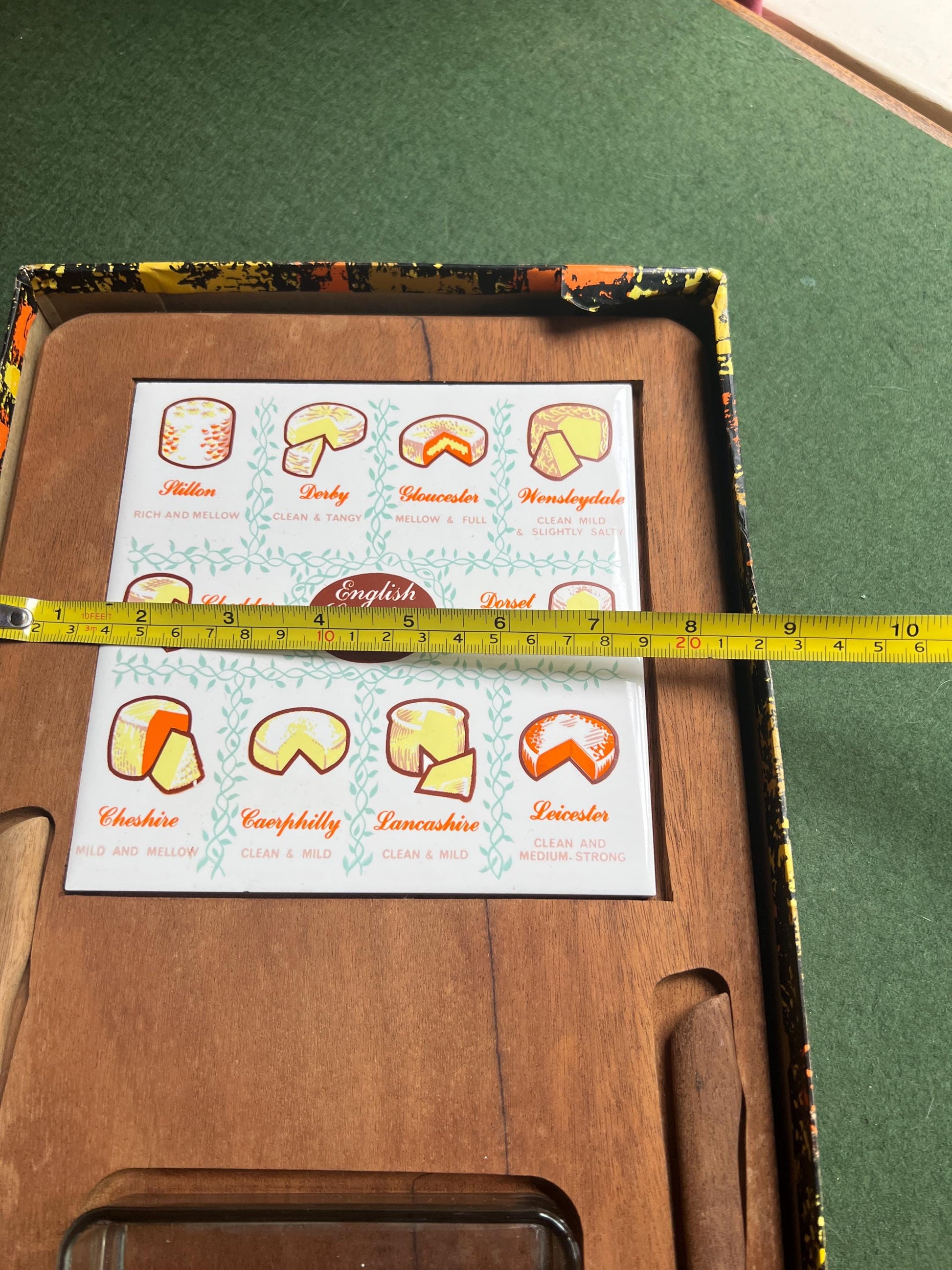 1970s MCM cheese board. Wooden cheese serving platter with ceramic English Cheeses tile insert glass Butter dish and original stainless steel wood handled knives stamped Millcross stainless Made in England. Original box all complete. Great vintage condition - some wear to box. Board is approximately 14 inches by 8.5 inches A great cheese lover host gift.