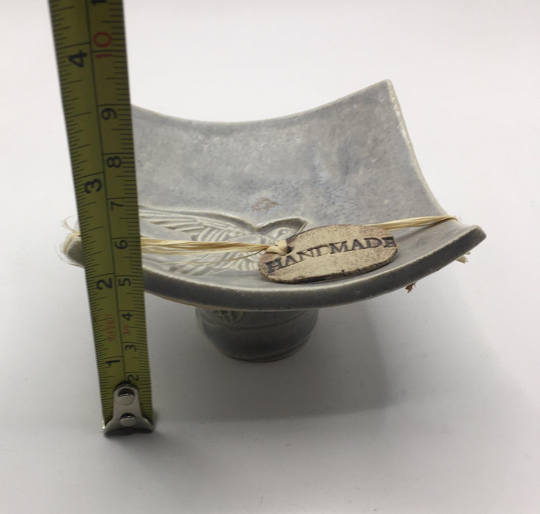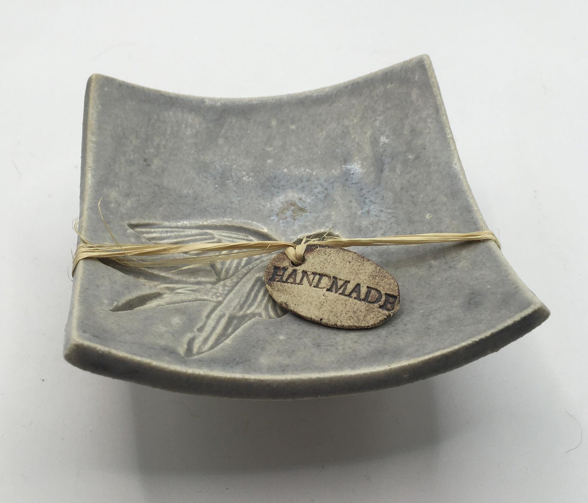 Handmade pedestal square trinket dish. Sgraffito flying bird design. Stamped. With original label. Beautiful grey blue glaze great condition. Approximately 4 inches square and 2 inches tall. Hall table key dish or dressing table decor.